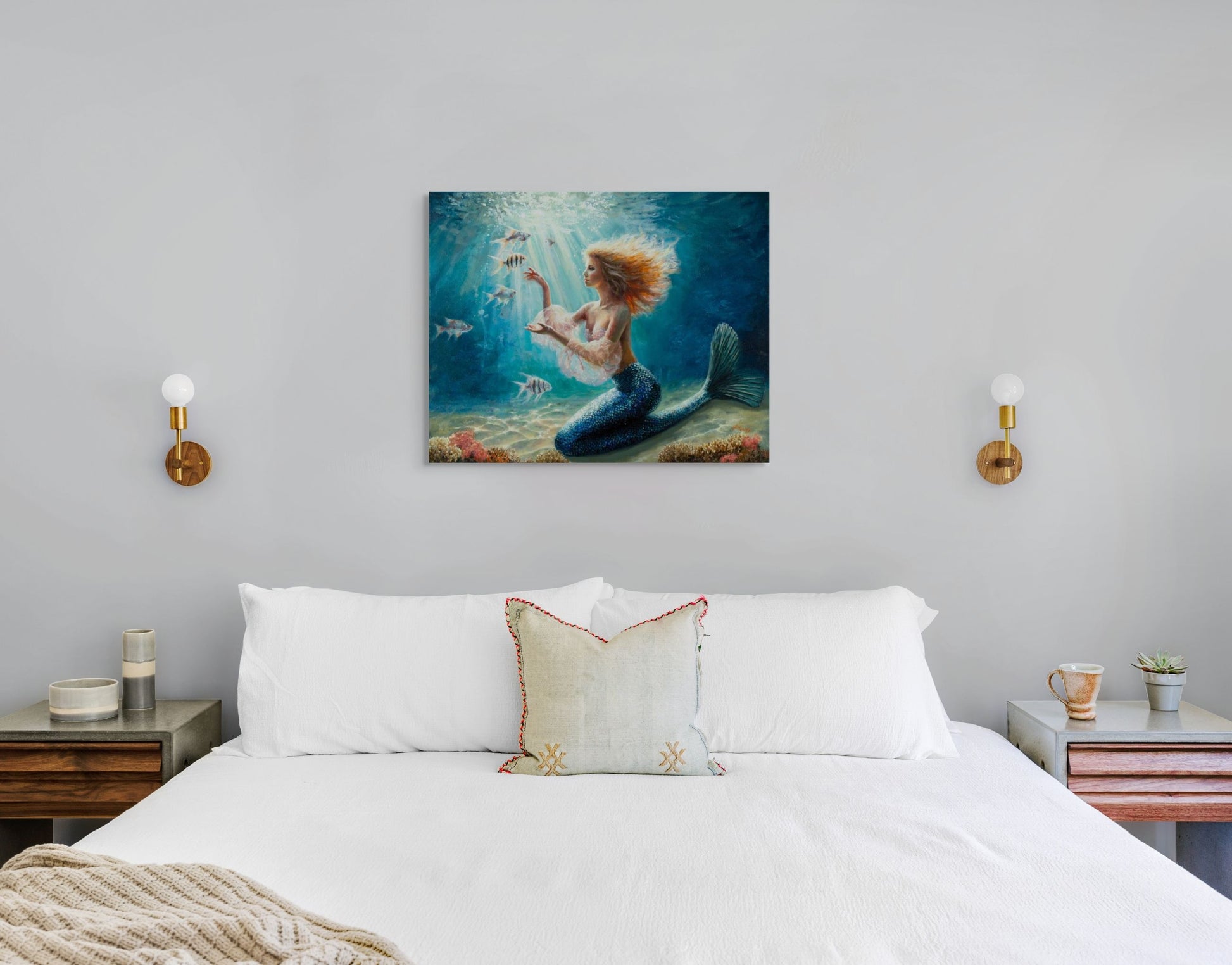 A museum-grade canvas print of "Fragile Threads of Life", featuring a quiet moment of connection from the Mysteries of the Deep collection. A mermaid stretches her hand upward, almost touching a tiny fish suspended in the water, as other fish glide gently nearby. This peaceful scene reflects the fragile balance of life beneath the waves, and the delicate connections that unite us with the natural world. Professionally stretched and ready to hang - or frame to suit your space. A portion of proceeds supports ocean conservation.